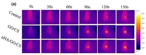 協和醫院骨科醫院楊操教授團隊以殼聚糖為載體制備了一種新型的光熱可控的多功能納米羥基磷灰石/氧化石墨烯/殼聚糖(nHA/GO/CS)支架。該支架通過光控,可以在48?°C的近紅外照射下有效地殺傷HOS,并在42?±?0.5?°C的溫度下促進細胞增殖及成骨分化。該支架具有良好的止血效果,有利于近紅外照射下的周圍軟組織修復。
