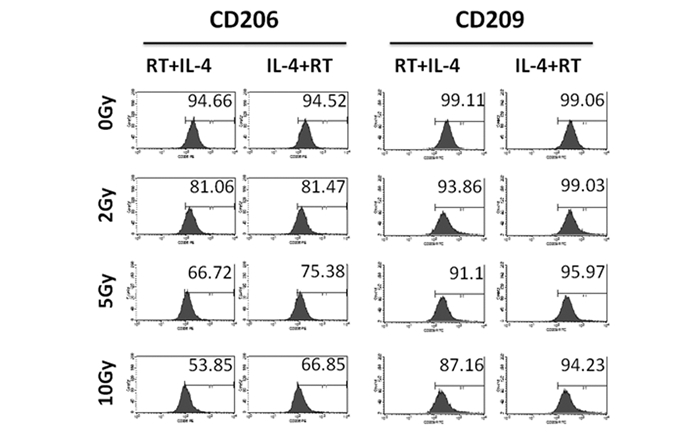 圖4. 流式細胞術分析照射對IL-4誘導的小鼠RAW264.7細胞CD206和CD209的表達