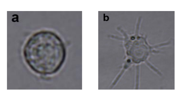 圖1. a.RAW 264.7 未分化形態圖 b.RAW 264.7 M1型分化形態圖