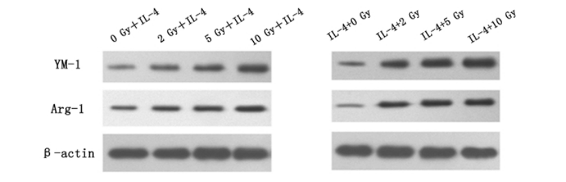 圖3. WB分析照射對IL-4誘導的RAW264.7細胞YM-1和Arg-1的表達影響