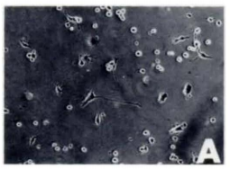 培養中始終存在一些黑點樣碎片,不需要特殊處理。大部分細胞呈不規則圓形懸浮狀態,有少量細胞呈梭形貼壁。